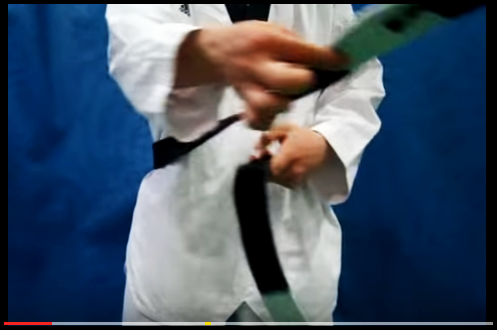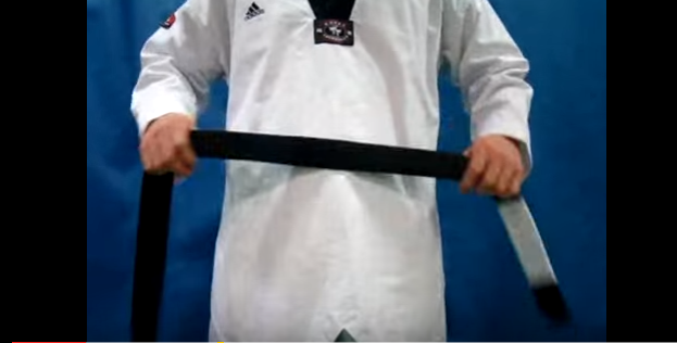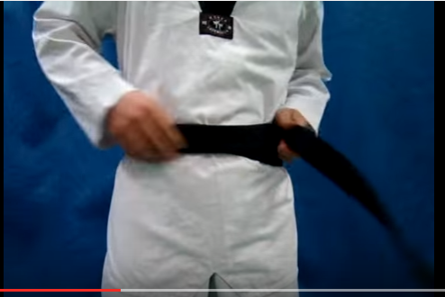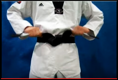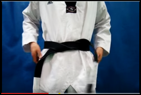 1.도복끈의 끝자락을 한뼘정도 남기고 사진처럼 허리에 돌립니다.